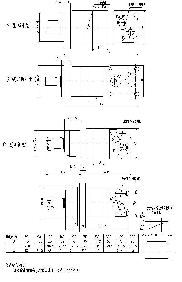 表中數(shù)據(jù)在使用68#抗磨液壓油,50℃ 油溫條件下測試的,不同馬達結果略有差別